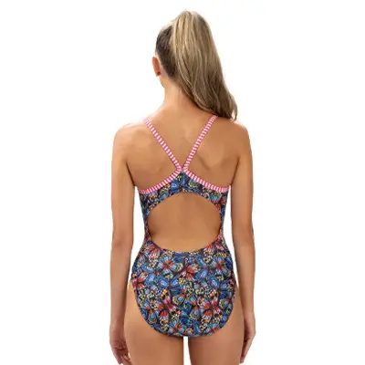 - V-back one piece swimsuit with open keyhole back detail